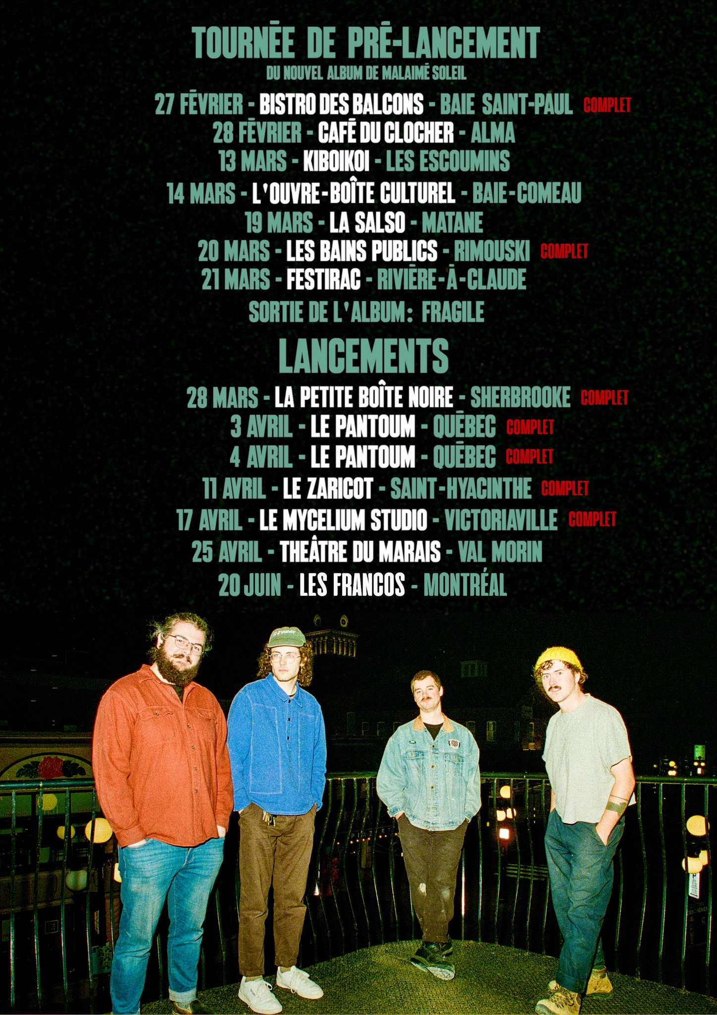 D'ailleurs, si tu veux tout entendre avant la sortie officielle de Fragile, le band va traîner les albums physiques sur la route. En gros, si tu veux l'entendre (et le tenir dans tes mains) avant le reste du Québec, c'est en show que ça se passe! Montréal : le lancement se passe au Club Soda dans le cadre des Francos le 20 juin 2026! On s'y voit?